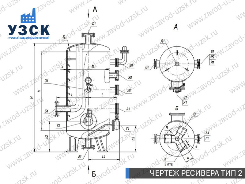 Ресивер воздуха (воздухосборник, воздушный ресивер) | 0,5 — 200 м3 | До 6,3 МПа | горизонтальный ресивер / вертикальный ресивер | Ст3, Ст20, 16ГС, 09Г2С, 10Г2С1, 12Х18Н10Т, 08Х18Н10Т (или аналоги) | накопление сжатого воздуха, вырабатываемого компрессорами | В-0,5 В-1 В-1,6 В-2 В-3,2 В-4 В-6,3 В-8 В-10 В-16 В-20 В-25 В-32 В-40 В-50 В-60 В-80 В-100 В-200 |